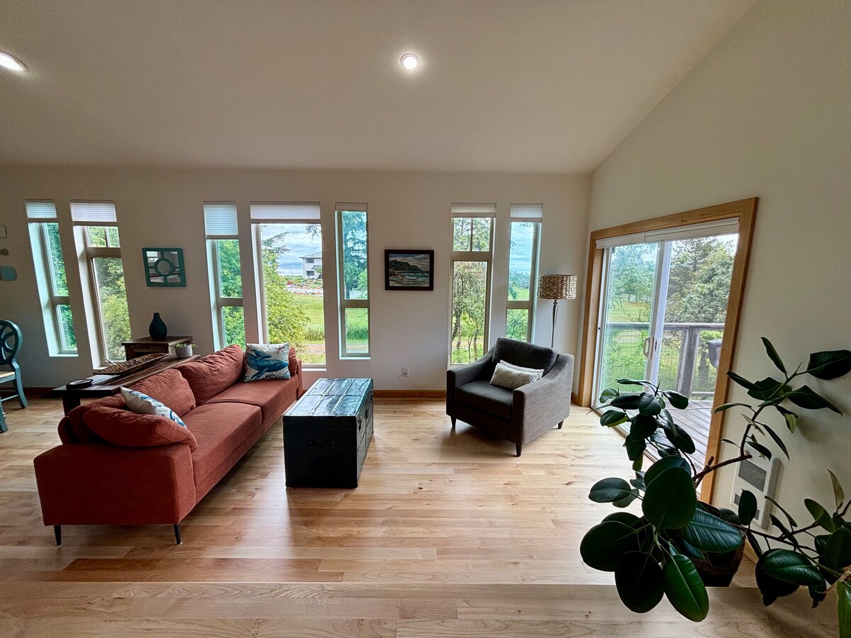Casa de campo contemporânea de 2 andares recém-construída à beira-mar com 2 quartos. Assista ao nascer do sol todas as manhãs através da nossa janela da sala de estar de 2 andares. Desfrute de uma vista incrível da enseada de Spring Cove e da floresta tropical. Cozinha totalmente equipada para cozinhar todas as suas refeições. Churrasco no convés traseiro. Sofá-cama tamanho Queen na sala de estar. Ótimo espaço para até 6 pessoas. Localização perfeita! 5 minutos a pé da trilha mais deslumbrante de Ucluelet: o circuito do farol. **NÃO SÃO PERMITIDOS ANIMAIS DE ESTIMAÇÃO.