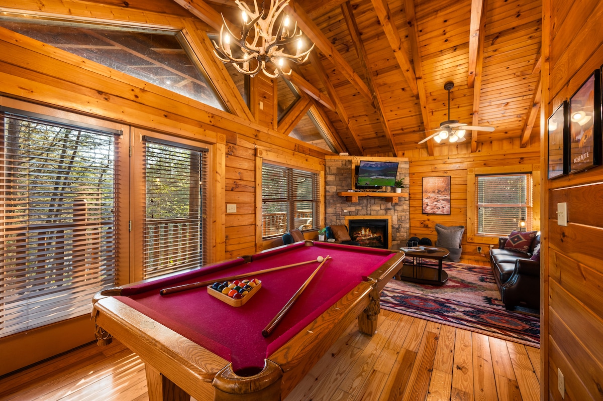 A cabana de madeira de vários andares de tirar o fôlego está aninhada dentro de um pitoresco resort de montanha, oferecendo vistas deslumbrantes das Montanhas Great Smoky. No interior, o chalé apresenta um plano luminoso e aberto com uma cozinha completa, uma luxuosa cama king, sala de jogos com loft e dois decks com uma luxuosa banheira de hidromassagem. Os hóspedes também terão acesso ao resort, incluindo uma piscina (sazonal) e academia (sazonal). O chalé fica a poucos minutos de Pigeon Forge e Dollywood, com uma abundância de restaurantes, lojas e atrações.