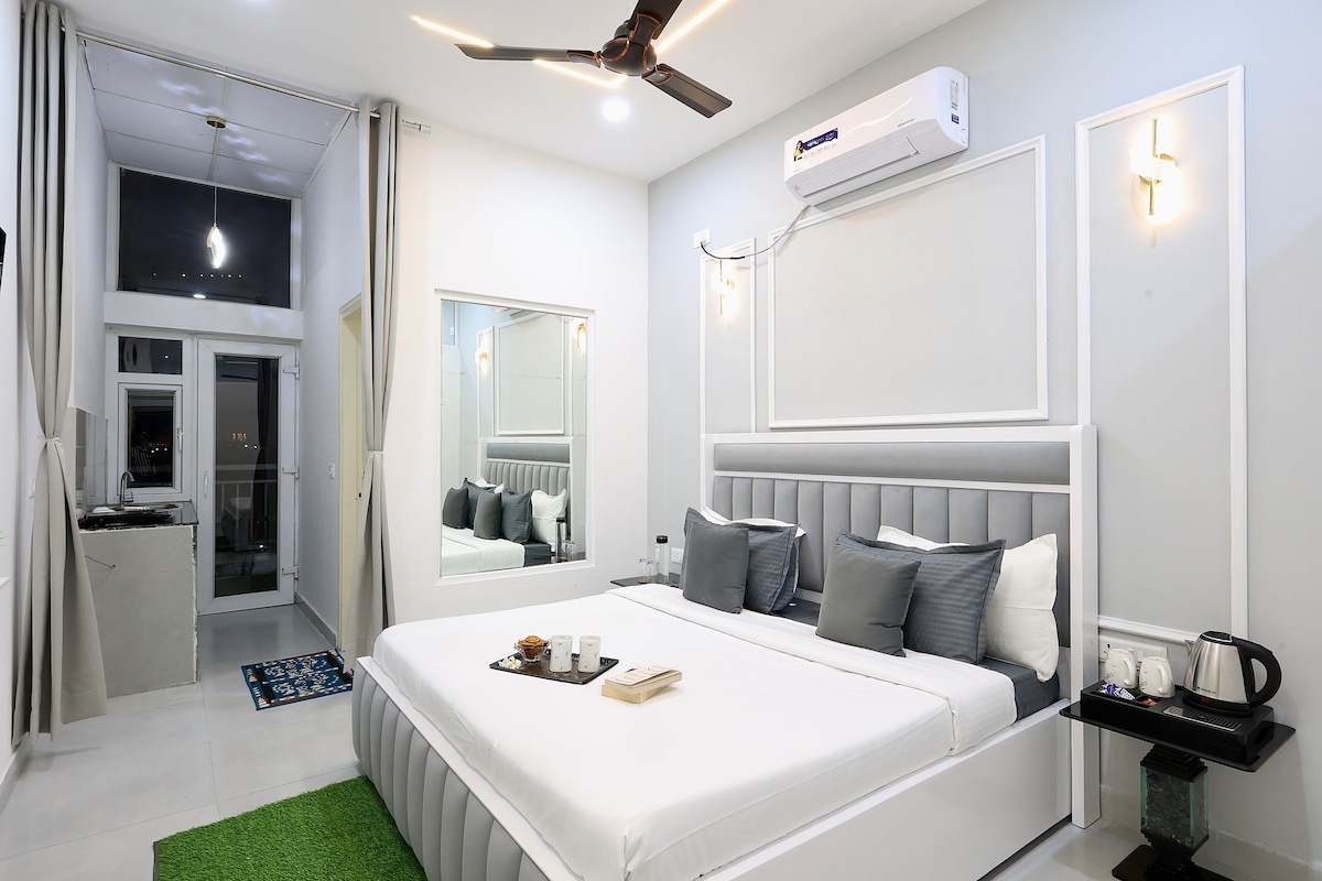 A couple friendly Private apartments with stunning views, a king-sized bed, and a fully-equipped kitchen. Enjoy seamless connectivity with fast WiFi and stay entertained with our sleek smart TV with free access to OTTs. Complimentary amenities include an electric kettle, induction cooktop and toiletries - your home away from home! Daily cleaning is available and the timings are (11 AM to 6 PM) Compulsory ID proof (Adhaar/DL/Passport) required for all guests before check-in.