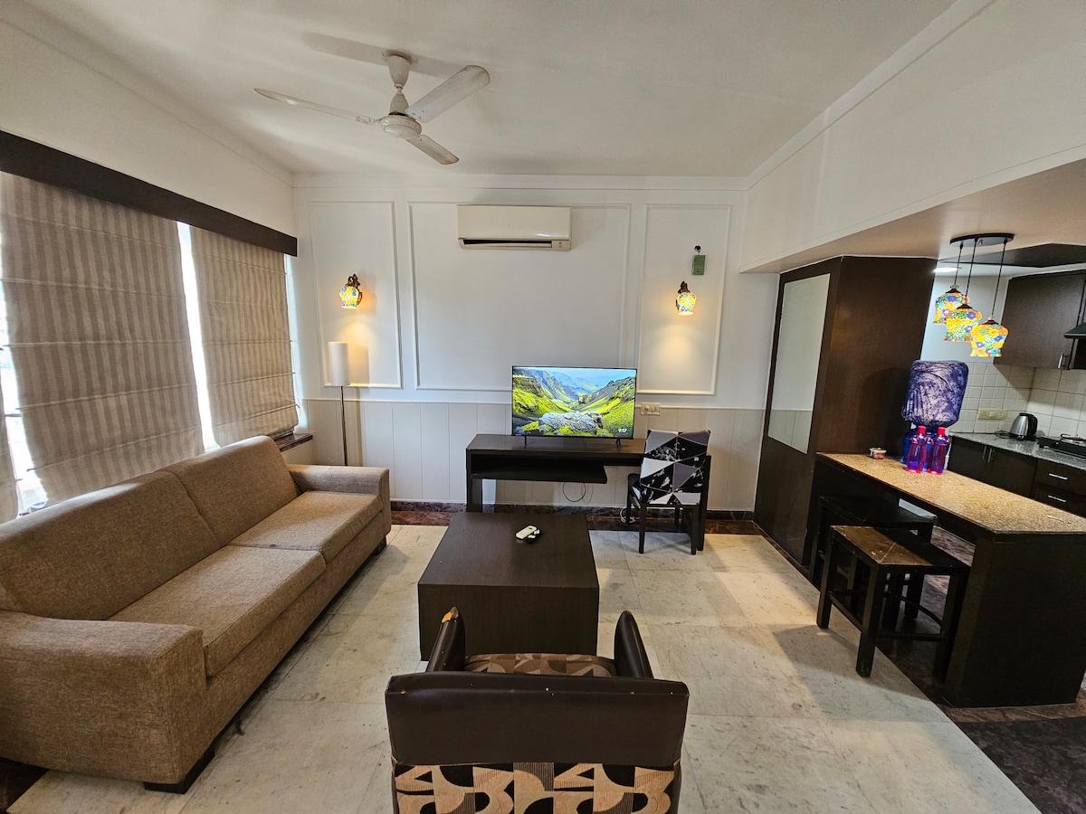 Bem-vindo ao nosso espaçoso apartamento de 2 quartos, perfeito para famílias ou pequenos grupos! Cada quarto é cuidadosamente projetado para o conforto, com camas aconchegantes e amplo armazenamento. A área de estar em plano aberto possui um confortável lounge e uma cozinha totalmente equipada, ideal para relaxar e cozinhar juntos. Desfrute de comodidades modernas, Wi-Fi de alta velocidade e um espaço de jantar encantador. Localizado em um bairro vibrante, você está a poucos passos de atrações locais, lojas, restaurantes e a 9 minutos do Gaur City Mall.