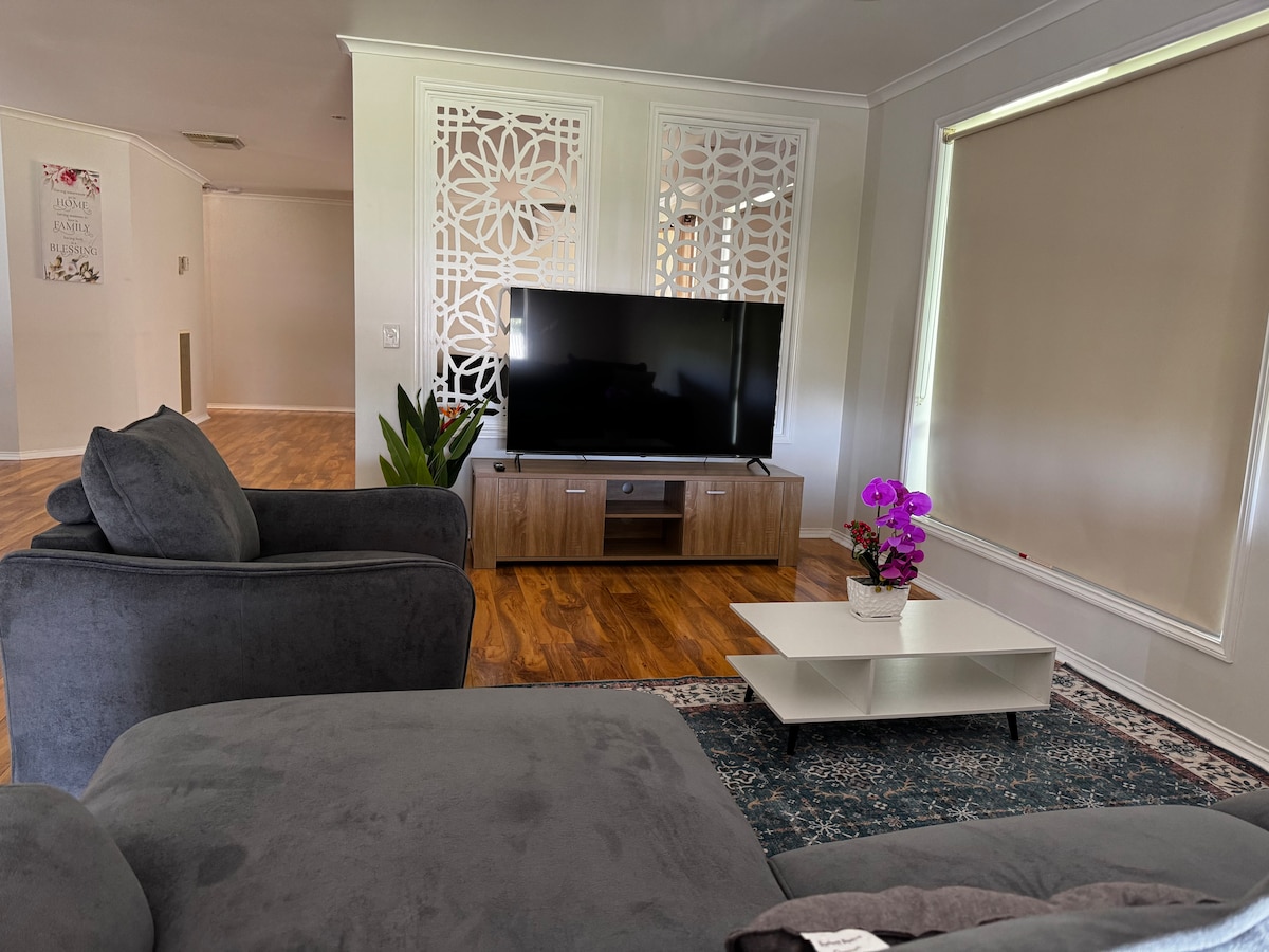 Located within a peaceful part of Country North Shepparton,this home has everything you need to relax & unwind- Luxurious & spacious living area’s,4BR=2 King,2 Queen (EXTRA bed set up 9th/10th guest(Extra payment request sent by Host)$50pp LARGE outdoor entertainment/BBQ area, salt Solar heated Pool! Perfect for all those sunny days. Secure backyard 4 kids or fur babies. 5min Drv to CBD! 2min from Supermarket/Hospital/Sports Stadium/Soccer/hockey/Golf/GYM/BMX/Equestrian.GARAGE NOT AVAILABLE