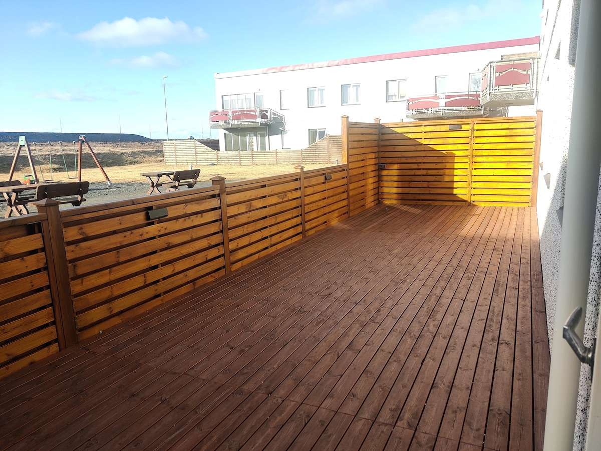 Bem-vindo à nossa casa de família. Tem dois quartos, cama de casal em cada um. Podemos adicionar cama extra (para bebê) ao quarto. Há um grande pátio que leva a um jardim com parque infantil. Vaga de estacionamento na frente, bairro agradável e tranquilo. O apartamento deve ter tudo para suas necessidades básicas a apenas 10 minutos do aeroporto, 14 minutos da lagoa azul e 20 minutos da área de Reykjavik (a capital). Boa localização para o Eclipse Solar12 de agosto de 2026 ❤️☺️