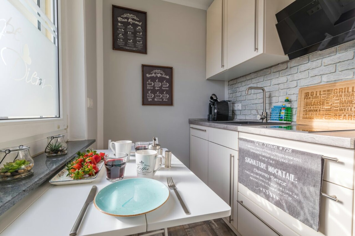 Podemos oferecer um apartamento novo e exclusivo, luminoso e cheio de luz com set. Banheiro (vaso sanitário, chuveiro), nova cozinha totalmente equipada e equipamentos de luxo - também para a área de negócios (Wi-Fi gratuito). Nosso apartamento tem uma cama box spring e um sofá-cama. O apartamento foi projetado para 2 a 3 pessoas. Se você deslizar para baixo no sofá-cama de 140 m de largura, você também pode dormir 2 pessoas lá. Um berço pode ser adicionado.
