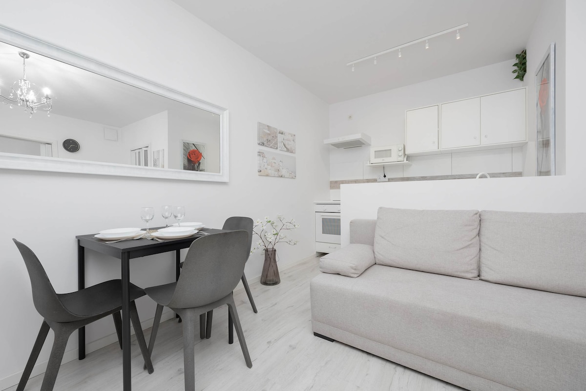 Apartamento confortável e totalmente equipado em um edifício novo. Sala de estar com cozinha aberta dividida em área de jantar e de estar. O quarto tem uma cama grande e um guarda-roupa espaçoso. Há também um guarda-roupa como espaço de armazenamento adicional. Nas proximidades há lojas, restaurantes e cafés Equipamento: ar condicionado, máquina de café, chaleira, ferro, tábua de passar, máquina de lavar Como chegar do Aeroporto Chopin 20 min de táxi 50 min de transporte do Aeroporto de Modlin 50 min de táxi 120 minutos de transporte