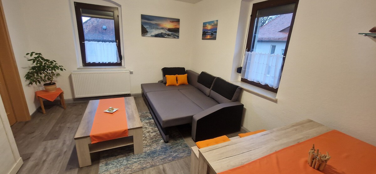 Nosso acolhedor apartamento de 2 quartos está localizado no 1º andar da casa. Tem uma sala de estar com área de jantar, uma cozinha separada totalmente equipada, um banheiro com chuveiro. No quarto há uma cama de casal, um berço portátil está disponível e pode ser reservado, se necessário. No sofá-cama da sala também há espaço para mais uma pessoa dormir, a Smart TV com Magenta TV e RTL+ oferece entretenimento, bem como livros e jogos.
