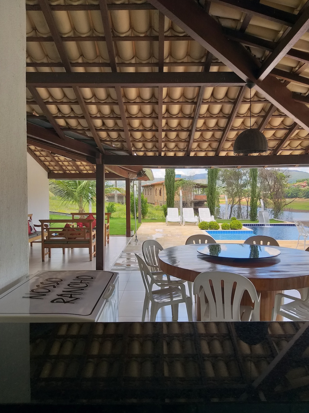 Rancho a aproximadamente 08km de Capitólio e 01km de estrada de terra. Acomoda até 12 pessoas (2 camas de casal, 2 de solteiro e colchões extras no chão). Cozinha equipada com panelas, pratos, talheres etc.; geladeira, freezer, micro-ondas, forno e liquidificador. Varanda ampla, com churrasqueira. Piscina. Sala com Smart TV e sofá. Wi-Fi. 03 Ventiladores. Banheiros: 1 social interno, 1 na suíte e 1 na varanda Não fornecemos roupa de cama, itens de higiene pessoal ou produtos de limpeza.