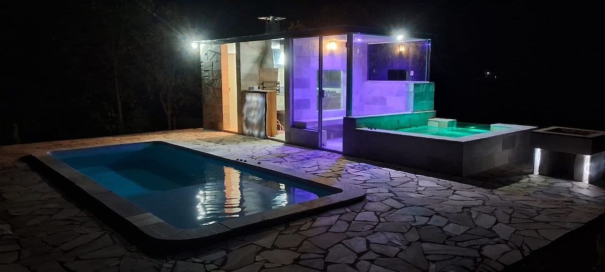 Refúgio perfeito para momentos inesquecíveis (Feriados preço a combinar) -8 suítes aconchegantes com ar-condicionado -2 suítes com hidromassagem aquecida -Piscina com iluminação especial -Hidromassagem aquecida na área de lazer -Sauna relaxante -Acomoda até 22 pessoas em cama -Lareira externa para tomar um vinho -Cozinha equipada com utensílios básicos para o dia a dia -Limpeza e cuidado: uma pessoa passa todos os dias pela manhã para trocar a água da banheira e garantir o conforto dos hóspedes