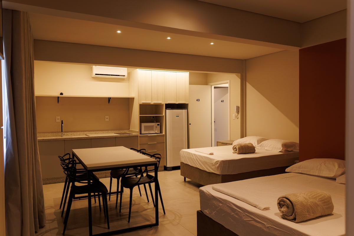 Nosso espaço conta com tudo que o hóspede precisa para uma estadia confortável. Com uma cama box de casal, uma cama box de solteiro, guarda-roupas, mesa com quatro cadeiras, frigobar, cooktop com duas bocas, micro-ondas, cozinha 100% completa (não possuímos forno), com todos utensílios básicos necessários para a preparação de uma refeição chuveiro elétrico, secador de cabelo, Wi-Fi e tv smart. Além disso, os enxovais de cama e banho são incluídos e higienizados após cada checkout para garantir seu conforto e segurança.
