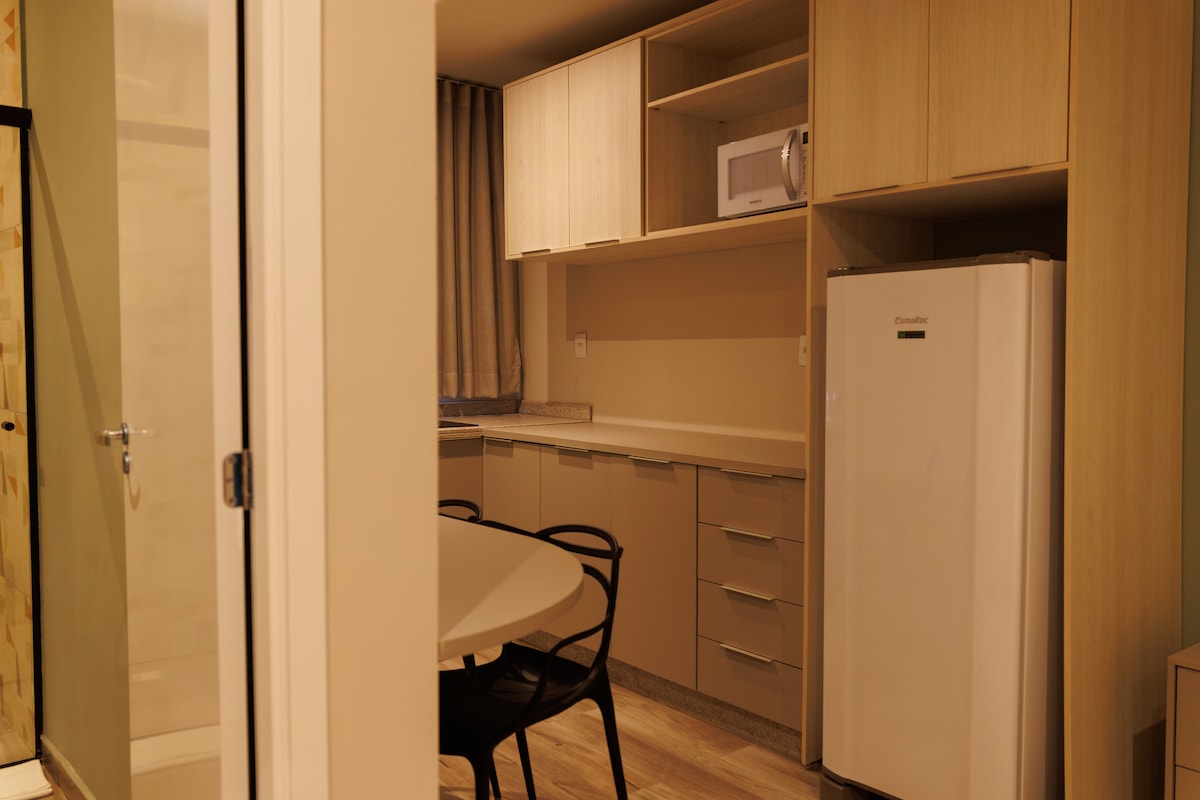 Studio novo, moderno e cheio de charme no coração da cidade! Desfrute de uma estadia confortável em um espaço recém-inaugurado, com tudo o que você precisa para se sentir em casa. O studio conta com ar-condicionado, frigobar, cooktop, micro-ondas e utensílios básicos de cozinha, ideal para quem gosta de praticidade. Você terá à disposição um banheiro privativo, além de itens essenciais como shampoo, condicionador. O ambiente também inclui cabideiro, espelho e um ótimo padrão de limpeza.