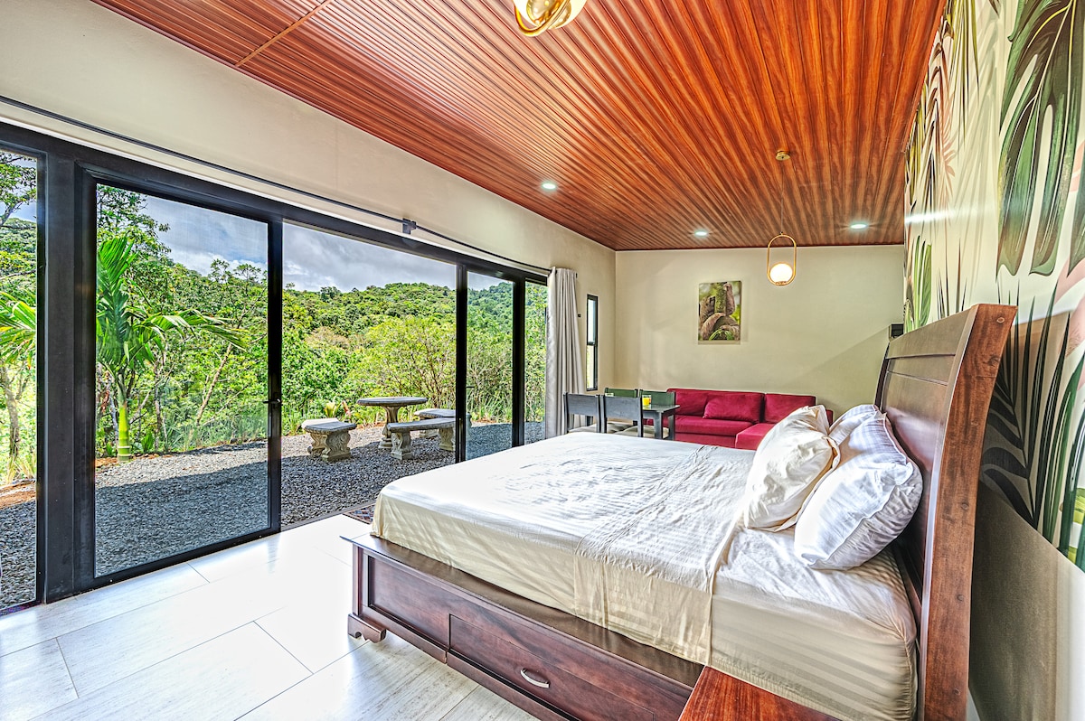 Relaxe nesta tranquila casa de 2 quartos, 2,5 banheiros, na selva, cercada por jardins tropicais e vistas deslumbrantes para o lago. Ideal para casais, famílias ou trabalho remoto. Há uma cozinha bem equipada para cozinhar em casa, enquanto os restaurantes estão nas proximidades e a cidade de Nuevo Arenal fica a cinco minutos de carro. Precisa trabalhar enquanto estiver fora? Desfrute de uma configuração confortável de trabalho remoto com uma mesa, cadeira e Wi-Fi confiável.