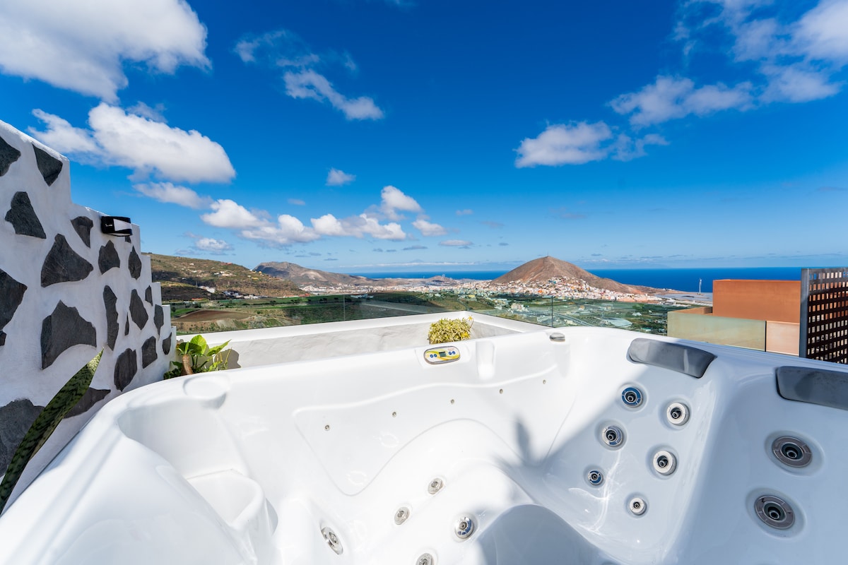 Apartamento com varanda para desfrutar de momentos e vistas incríveis. Você pode desfrutar jantando ou na jacuzzi. Tem tudo o que você precisa, está em um espaço privado que consiste em apenas 2 apartamentos, com piscina e solário cercado por plantas e flores, criando um espaço de total tranquilidade ideal para descansar ou trabalhar desfrutando da natureza e a apenas 10 minutos de carro de Las Palmas.