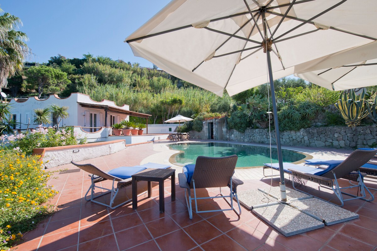 Uma piscina térmica, uma sauna natural. Uma vila exclusiva imersa em um jardim exuberante, suspensa entre o céu e o mar. No encantamento da Baía de Citara, uma das mais evocativas da ilha porque está totalmente exposta ao oeste: pores do sol sonhadores com o sol vermelho que se põe no mar aberto atrás da ilha de Ventotene, o único obstáculo para o olhar aberto no imenso horizonte. Seis quartos duplos, frescos, panorâmicos, cada um com seu próprio banheiro, ventiladores e frigobar.