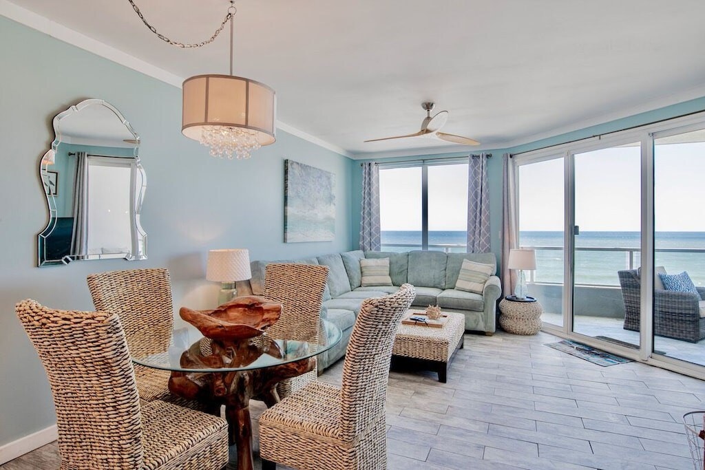 Acabamos de atualizar nosso novo condomínio à beira-mar com novos móveis de sala de estar, novo piso de azulejos de madeira nos quartos, novos eletrodomésticos, colchões, smart tvs, máquina de lavar/secar roupa, prancha/batten, decoração de praia. Tetos de Trey, moldagem de coroas, corredores raros com ar condicionado entre elevadores e portas da frente. Estacionamento em garagem coberta de até 2 carros ($ 50/carro por estadia paga no check-in) Comodidades agradáveis em um prédio de baixa densidade com elevadores responsivos para tempos mínimos de espera.