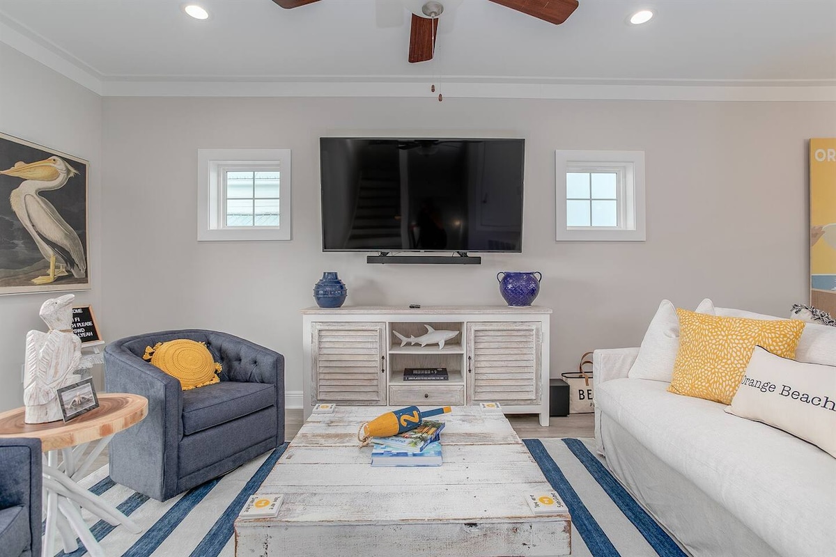 Uma casa de designer amigável para animais de estimação a poucos passos da praia Damos as boas-vindas aos snowbirds! Cansado de ficar na fila para os elevadores? Sendo cobrada uma taxa por tudo? Deixar sua amada família peluda para casa? Não procure mais do que o Ben's Beach Bungalow para oferecer um espaço onde toda a sua família possa estar junto! Estamos localizados na encantadora Tannin Village em Orange Beach, do outro lado da rua da nossa entrada privativa para a praia. Você pode estar na praia e na água mais rápido do que um passeio de elevador do condomínio!