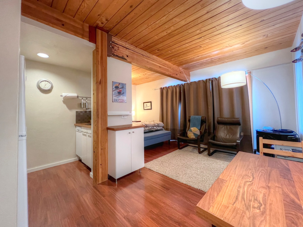 Mountain Hideout é um aconchegante 1bd. com fácil acesso à banheira de hidromassagem e traslado de esqui, ambos do lado de fora da sua porta! Este refúgio confortável e tranquilo na montanha tem uma cozinha de tamanho completo com fogão, forno, geladeira e utensílios de cozinha. Se você prefere comer fora, basta fazer uma caminhada de 5 minutos até a área de Base ou pegar o traslado gratuito! A sala de estar tem um sofá-cama para acomodar um terceiro hóspede. Depósito separado fornecido para esquis, bicicletas e outros pertences! Um ótimo bônus! Sem animais de estimação.