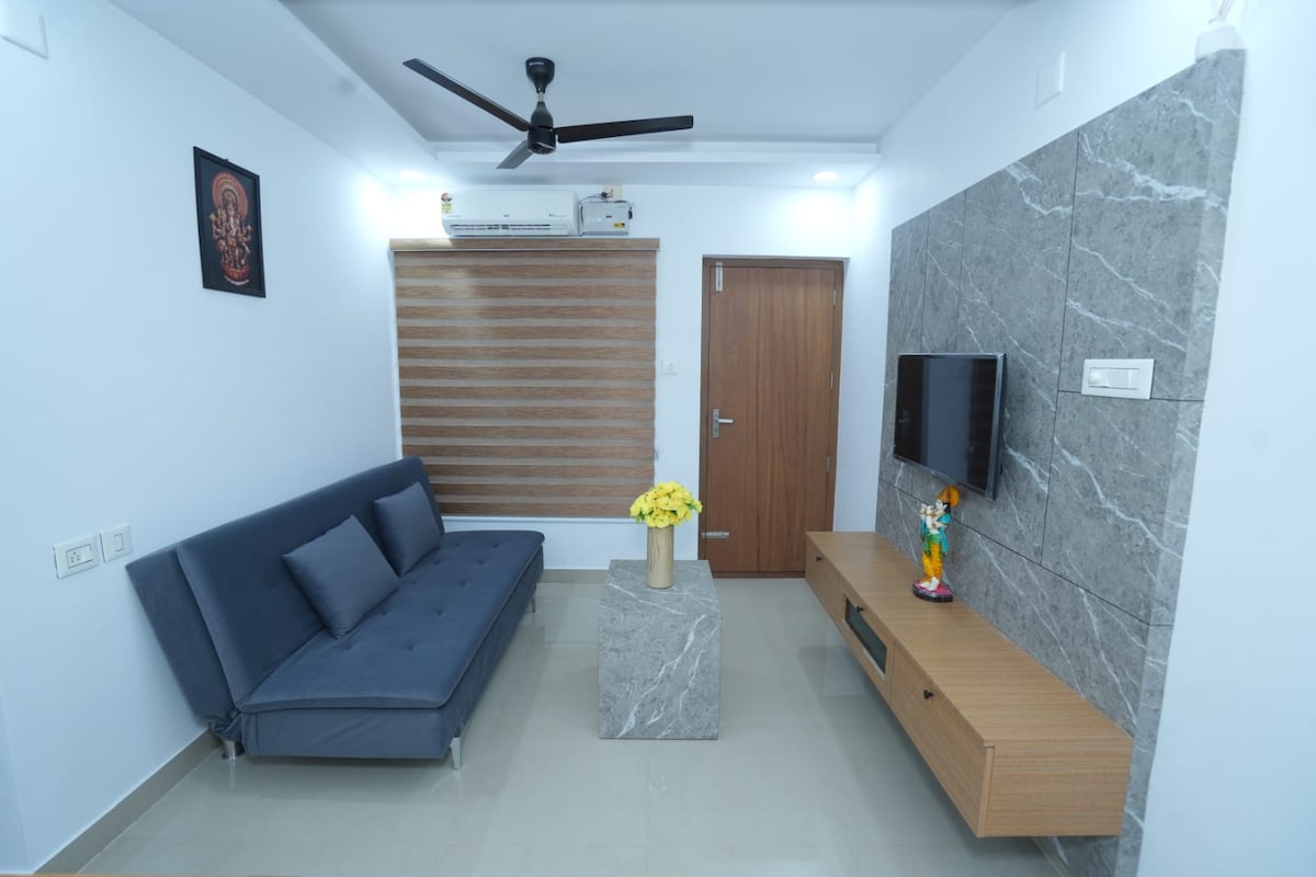 Apartamentos Samudhra: Apartamento Premium AC 1 BHK a apenas 700m do Templo Guruvayoor. Desfrute de um espaçoso quarto com cama king-size, TVs no corredor e no quarto, uma cozinha totalmente equipada com geladeira, máquina de lavar roupa, fogão de indução, chaleira e utensílios. Relaxe na acolhedora área de estar com sofá em forma de L, mesa de jantar, cama de casal e varanda privativa. — Inclui Wi-Fi rápido, água quente 24 horas por dia, 7 dias por semana, —Fácil acesso a restaurantes, lojas e estação ferroviária — Um total de 4 adultos e 2 crianças podem ser acomodados confortavelmente.