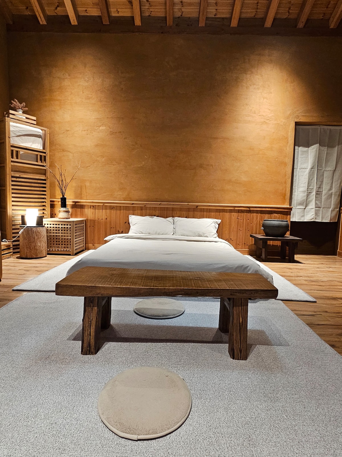 É uma casa de campo com várias árvores frutíferas localizada a uma altura de 420 m sob o Samdobong da Montanha Democrática, longe das movimentadas atrações turísticas do Parque Nacional Deokyusan e do Muju Resort. Demora cerca de 10 minutos para Taekwondo Won e Bandiland, e 25 minutos para Deokyusan Muju Resort. No interior da aldeia, você também pode apreciar a beleza natural do vale. A Uncle House é o edifício de estrutura de madeira de estilo americano mais isolado, projetado e construído pela prestigiada empresa de construção de madeira de Seul. O teto é alto, o verão é fresco e o inverno é uma casa quente, uma vista alta e ampla e um lugar quente para desfrutar da lareira com vista para as estrelas. O primeiro andar é o espaço do casal anfitrião, e o 56m2 (incluindo o terraço) no segundo andar é a casa de hóspedes. Tem uma entrada separada, e não é uma casa desconfortável porque há um anfitrião, mas é mais apreciado porque você pode obter ajuda e serviço imediatos. O churrasco estilo tio é um ótimo lugar para uma família americana, e as habilidades alimentares com a casa do tio são excelentes. A sala de sol com lareira privativa ao ar livre é de longe a melhor ♡