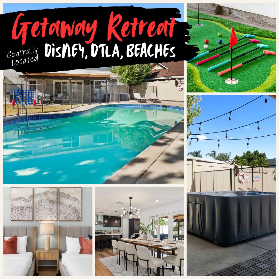 •Casa de piscina estilo boutique •14 milhas da Disneylândia • 5 camas queen size, 1 sofá-cama • Smart TV de 75 polegadas •Aceitamos animais de estimação • Duas cozinhas com eletrodomésticos e utensílios de cozinha • Piscina com plataforma rasa e aquecimento opcional •Mesa de jantar com 8 lugares •Lava e seca •Mesa de bilhar e fliperama •Chuveiro externo com água quente •Churrasqueira • Fogueira ao ar livre • Carregador de veículos elétricos US$ 10/dia de uso ilimitado. Plugue J1772. Os veículos Tesla precisarão de um adaptador (adaptador não fornecido)