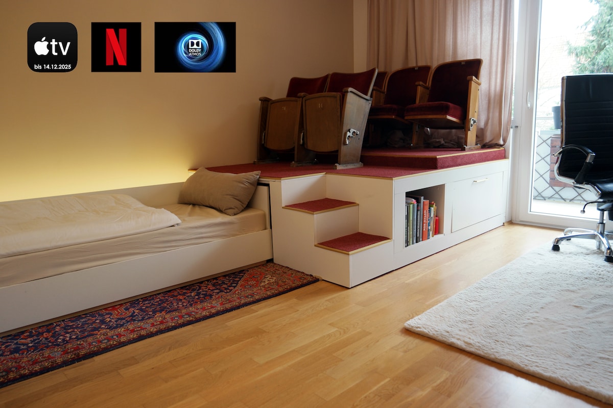 quarto aconchegante perto da estação de trem com cinema, varanda