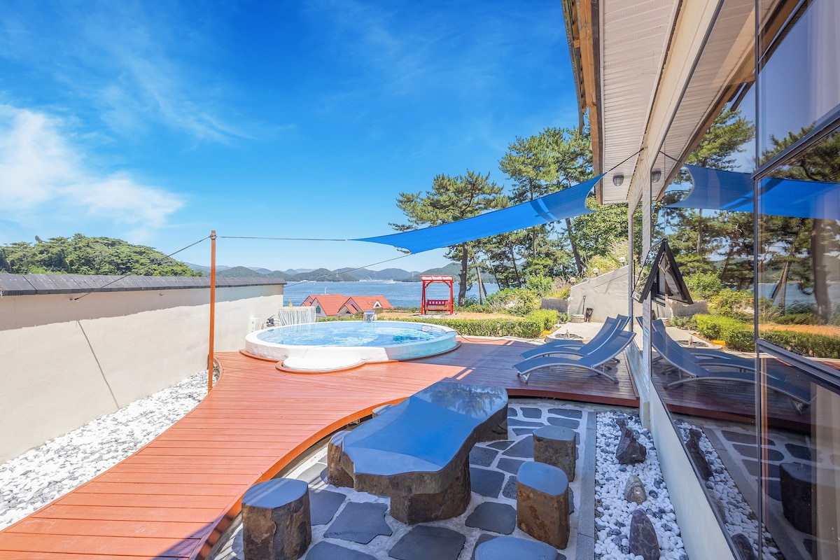 Nova casa isolada ao lado do Canal Tongyeong. É uma casa que foi recém-construída por um casal conhecido para uma vila após a aposentadoria. Você pode ficar confortavelmente enquanto observa o mar e passa por barcos. É uma casa isolada com um quintal, e o primeiro andar tem uma sala de estar cozinha vaso sanitário e cama dobrável, e o segundo andar tem um quarto banheiro vestiário. O terraço conectado ao quarto do segundo andar está equipado com um sofá ao ar livre, para que você possa desfrutar de vinho ou chá simples enquanto olha para o mar. Você pode usar a piscina no quintal, e churrasqueiras também estão disponíveis no quintal no primeiro andar.