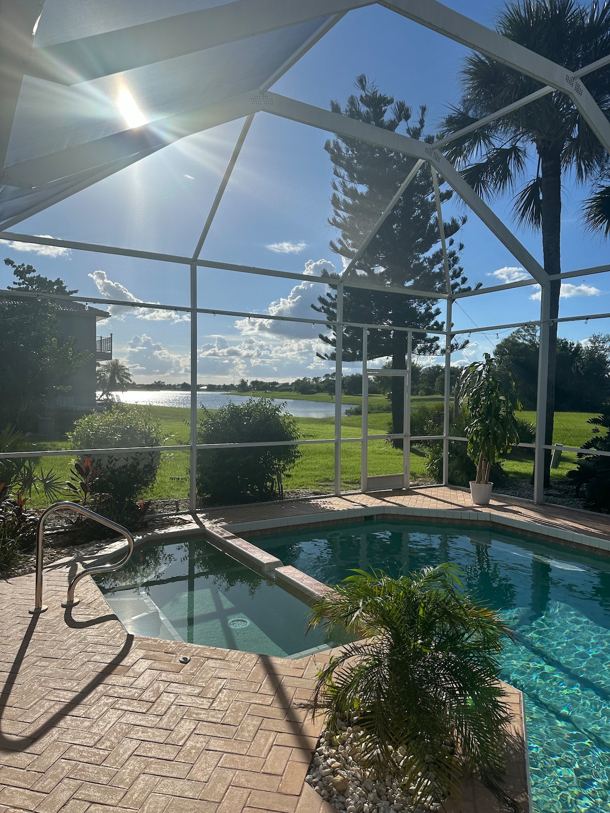 Bem-vindo ao Golf Cove Paradise ☀️ Um espaço ao ar livre tranquilo em estilo resort + piscina privativa grande aquecida por energia solar criam um oásis perfeito para as férias. Varanda coberta = sombra. Faça um churrasco e assista aos seus esportes favoritos na TV externa de 55”. Percorra as trilhas de carrinho de golfe, nade, bronzeie-se, leia um livro, ouça música e jogue, saboreie bebidas tropicais e deixe todas as suas preocupações para trás. Pôr do sol deslumbrante com vista para um campo de golfe. Café da manhã ao ar livre para ouvir o canto dos pássaros. Aqui, o que importa é a vida ao ar livre sem preocupações.