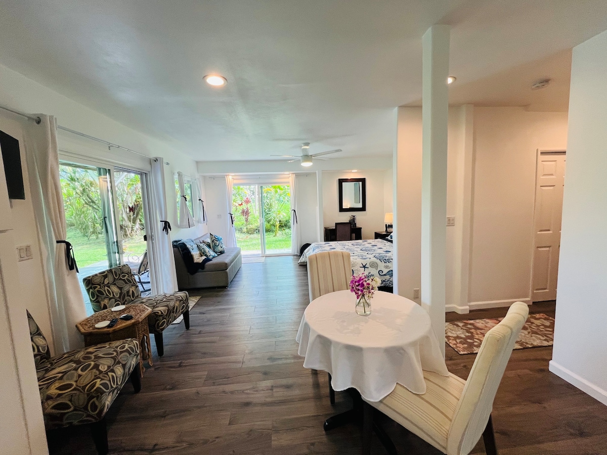 Por favor, venha e desfrute da nossa unidade tranquila e limpa no primeiro andar. Sente-se e relaxe no lanai coberto ou desfrute de uma taça de vinho perto do fogo. Ouça enquanto os coquis embalam você para dormir à noite e acordam suavemente com a cacofonia de pássaros tropicais pela manhã. A unidade de baixo no J&R's Banana Cabana oferece uma confortável cama tamanho queen, cozinha acoplada com micro-ondas e geladeira, e um banheiro privativo completo. Venha ficar, aproveitar e relaxar!