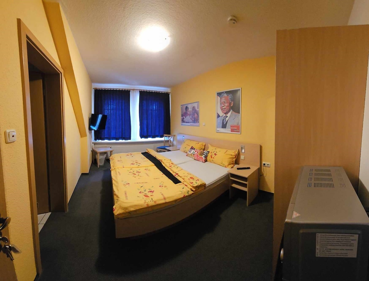 Quarto individual no único B&B em Buxtehude Acessível café da manhã pequeno: 1 croissant, 1 rolo, café ou chá, geleia : 8 euros café da manhã grande: cesta de pão, salsicha, queijo, ovo: 15 euros Café da manhã fitness: cereais, iogurte, leite, frutas, O suco: 15 euros Não há cozinha disponível para os hóspedes. Geladeira grande, chaleira, chá, cafeteira no quarto.