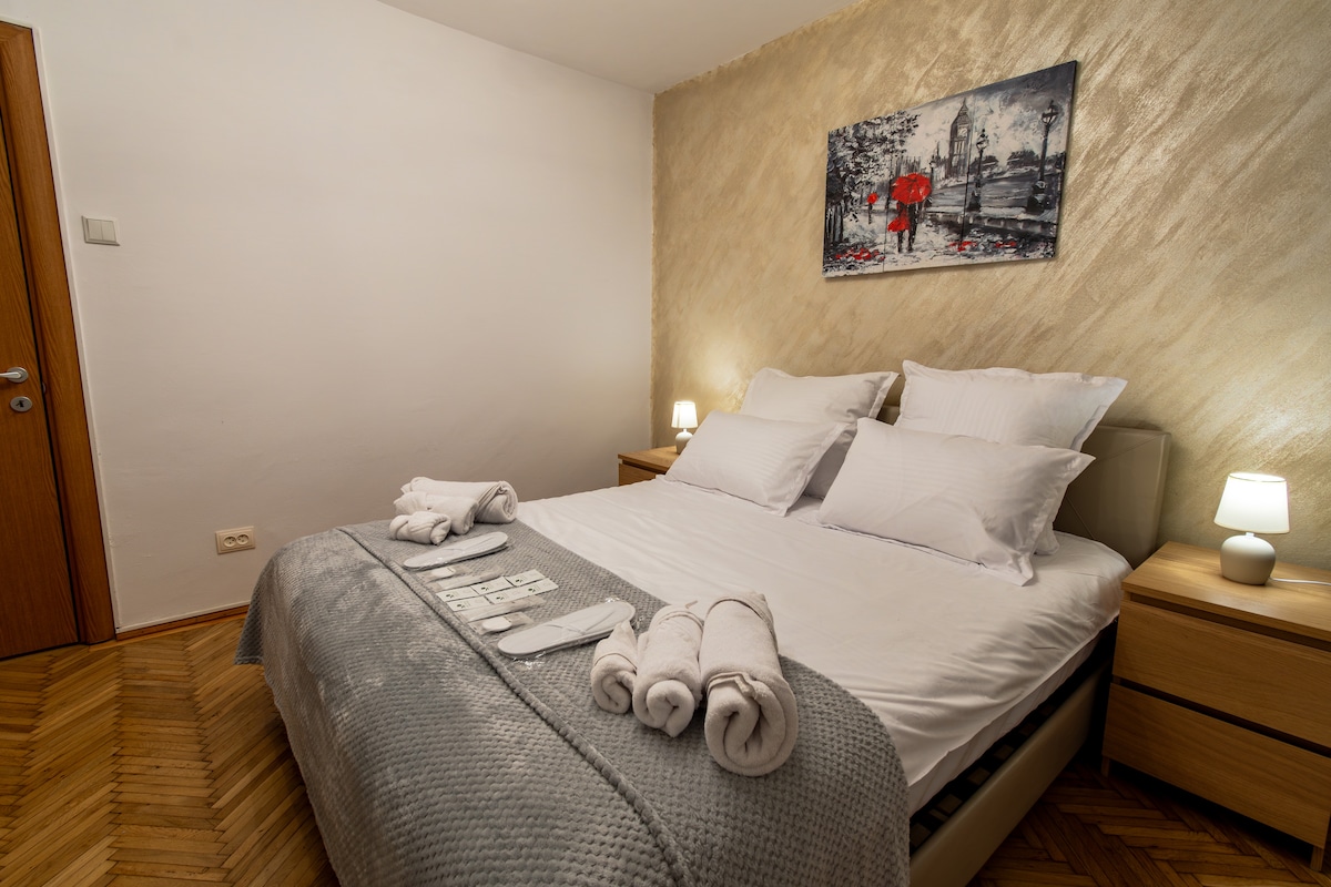 Desfrute de uma JACUZZI quente neste apartamento de 1 quarto e 1 banheiro, com localização ideal no norte de Bucareste, a poucos passos do centro de negócios. Possui tudo o que você pode desejar durante sua visita. Além do interior aconchegante, ele oferece um amplo terraço privativo de onde você pode contemplar o pôr do sol deslumbrante que brilha diretamente entre as torres: ✔ Estacionamento privativo gratuito no subsolo Cama queen size✔ confortável ✔ Cafeteira Nespresso Wi-Fi ✔ de alta velocidade ✔ Varanda privativa de 25 m²