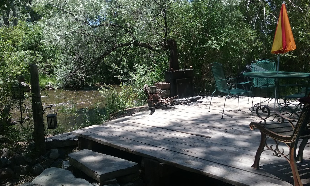 Chameleon: cabana de 2 quartos, SEM água corrente e sem banheiro na casita, acomoda 4 pessoas, possivelmente 5, duas (2) camas de casal no quarto e um sofá-cama para uma pessoa extra (por uma taxa adicional de US$ 20.) Fogão a lenha a placa quente e aparelhos elétricos para cozinhar. Deck aberto no rio Pecos! Com uma lareira ao ar livre. Banheiro comunitário com vasos sanitários e chuveiros, a 300 pés do Chameleon. Algum ruído da estrada pode ser ouvido, especialmente durante os horários de pico de viagem.