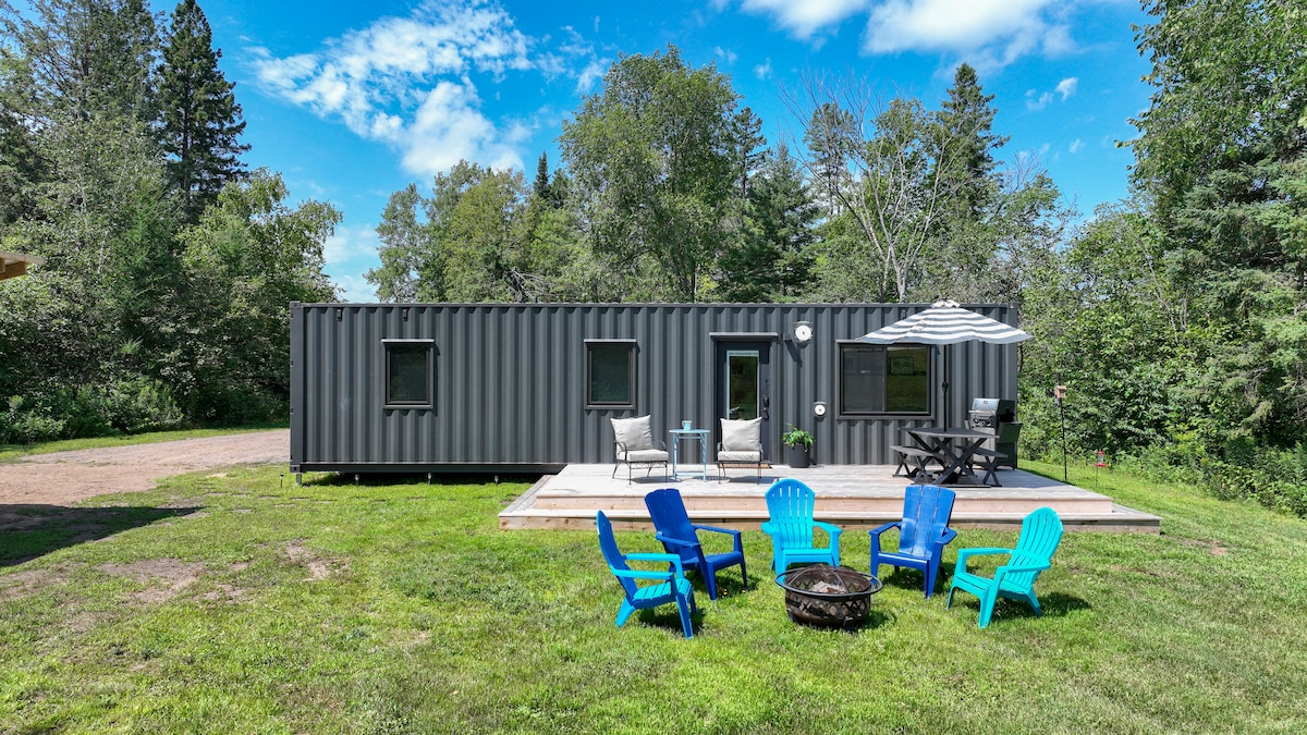 Nova casa de 520 pés quadrados 'não muito pequena' em 20 acres de área selvagem. Diversão o ano todo. Cães são bem-vindos. Plugue para trailer e veículo elétrico. Fogueira. Suas trilhas Snowshoe Creek e Little Wood Lake. Canoa, caiaque e pedal boat gratuitos. Barco pontão mini de US$ 40/dia. Pesca. Internet. Wi-Fi. Ar-condicionado. Lareira a gás. Dormir por número. Banheiro encantador. Fogão a gás novo. Máquina de gelo. 2 TVs. 3 cidades + Burnett Dairy/Bistro, 4 campos de golfe, DQ para refeições requintadas, mini-golfe, antiguidades, multi-teatro, praia Siren e 'Music in Park'. Vida selvagem! Você vai voltar.