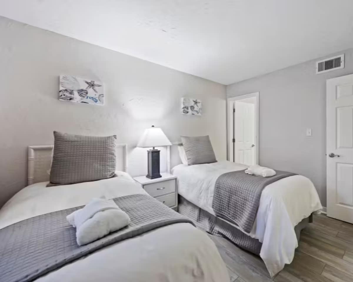 This 2-bedroom/2-bathroom suite with a balcony features a primary suite with a king-size bed, full tub and separate walk-in shower; a second bedroom with two full-XL beds, bathroom with walk-in shower; dining room; kitchen with stainless appliances; and a queen-size sofa bed in the living room. The suite also includes a 65" wall-mounted flat-screen TV, laminate flooring and tile bathrooms, lighted mirrors in both bathrooms, and stacked washer and dryer (side-by-side in accessible units).
