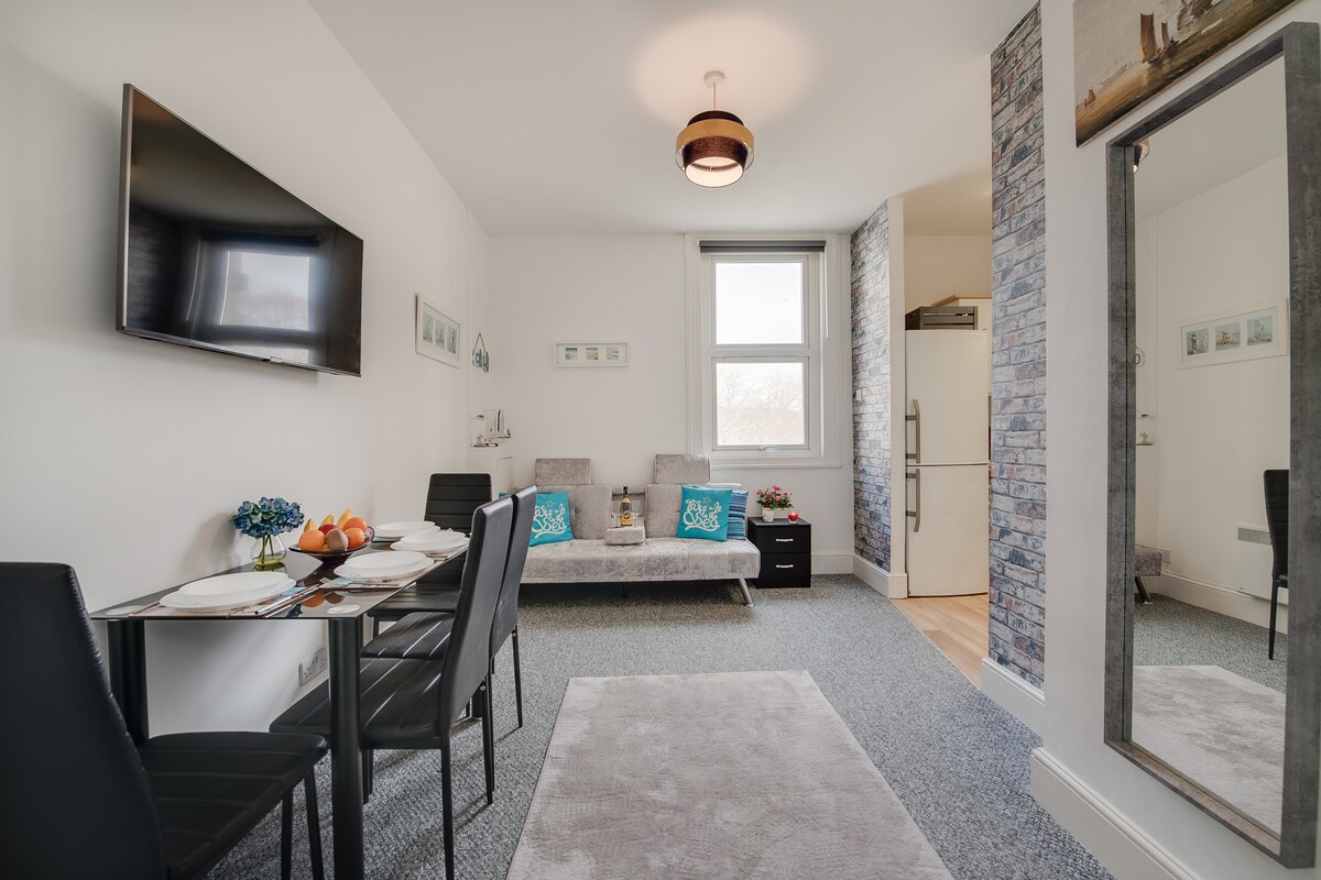 Recently renovated modern and spacious two-bedroom apartment in the heart of Portsmouth. Located just an 8-minute walk from Portsmouth Harbour station, this apartment offers an ideal location. It’s also conveniently close to Gunwharf Quays and the Historic Dockyards Museum. It comes with 1x free allocated parking with an option to park more cars for a small fee. It can comfortably accommodate up to five people, with three single beds, a king bed, and a sofa bed.