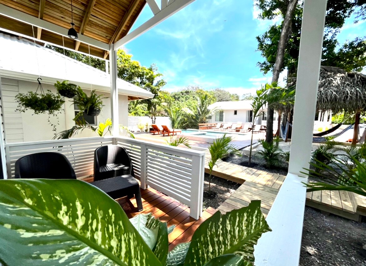 Esta acolhedora casita (estúdio) tem uma sensação tropical calorosa. É perto da piscina, mas não muito perto. Tem uma cozinha totalmente equipada com tudo o que você precisa para preparar refeições e manter suas bebidas geladas. O banheiro tem um chuveiro grande e muito espaço para você se preparar para sua noite no West End. Saboreie seu café da manhã em seu deck privativo e observe as araras selvagens voarem para sua visita matinal. A selva exuberante está ao seu redor com as brisas para mantê-lo fresco enquanto você relaxa na rede.