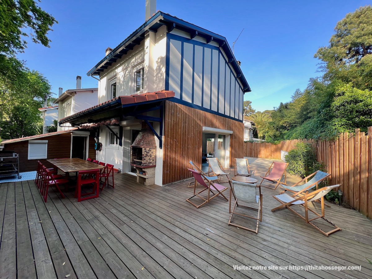 "KOLONAKI" Vila recente com 200m2 de espaço de estar, cozinha e sala de estar 120 m2, vista para a piscina aquecida garantida em meados de maio e meados de outubro, seus 5 quartos 4 banheiros, sua banheira de hidromassagem 5 pax aquecida durante todo o ano e sua plancha de canto. Chuveiro e vaso sanitário ao ar livre. Estacionamento para 3 carros na propriedade. Localizado a 800 m de pontos de surfe, tranquilo, discreto, à beira da floresta de Landes (saída de mountain bike e trilha de ciclismo Localização: 5 min de bicicleta para as praias, 10 min de carro para o golfe Seignosse.