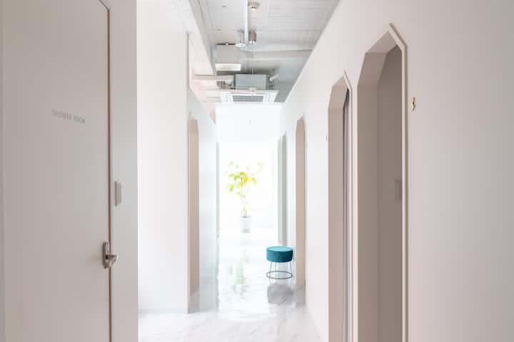 [CasaBlancaGuesthouse] ‘Casa Blanca’, que significa ‘Casa branca’ em espanhol é colorida com totalmente branco - do interior ao exterior -, oferecendo uma atmosfera organizada e amigável. Principalmente, o interior é projetado com padrões azuis e brancos, sendo usado como um design tradicional em Casablanca, uma cidade homônima no Marrocos.