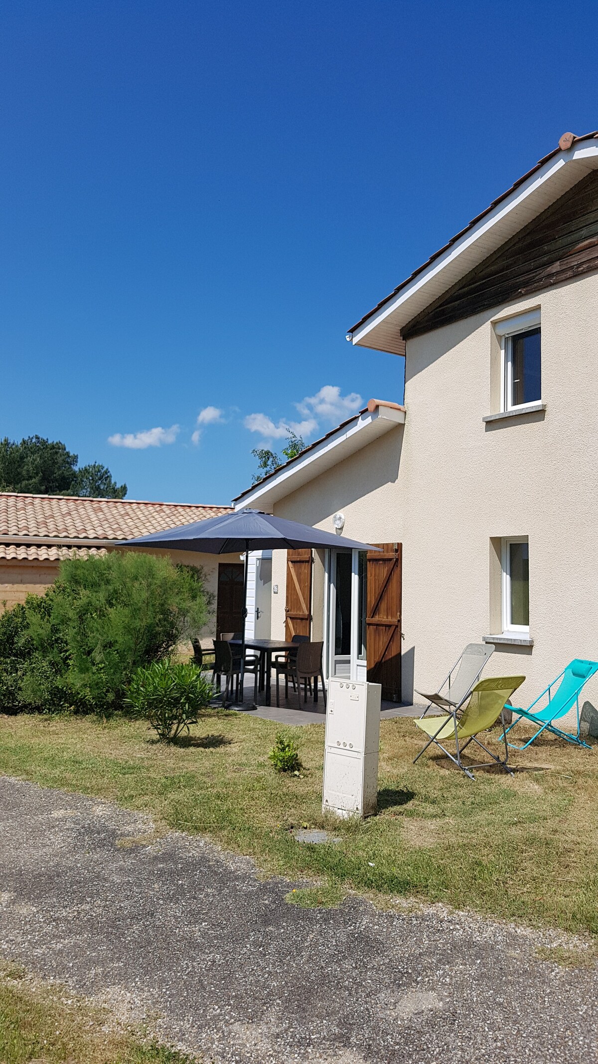 Maison de 42 m2 dans une propriété privé, un espace vert et terrasse. Situé a 3 km du lac et 10 km de l'océan. L' endroit est idéal pour des vacances au calme prés de la nature. Piste cyclable à 800 m vers l'océan ou le lac . Centre ville à 1,5 /2km La Terrasse extérieur avec sa pergola ,le barbecue, transats chaises longue, parasol , fauteuils pour passer des moments agréables et de détentes. Convient aussi à 2 collègues de boulot, car clic clac. Parking privé à l'intérieur de la propriété.