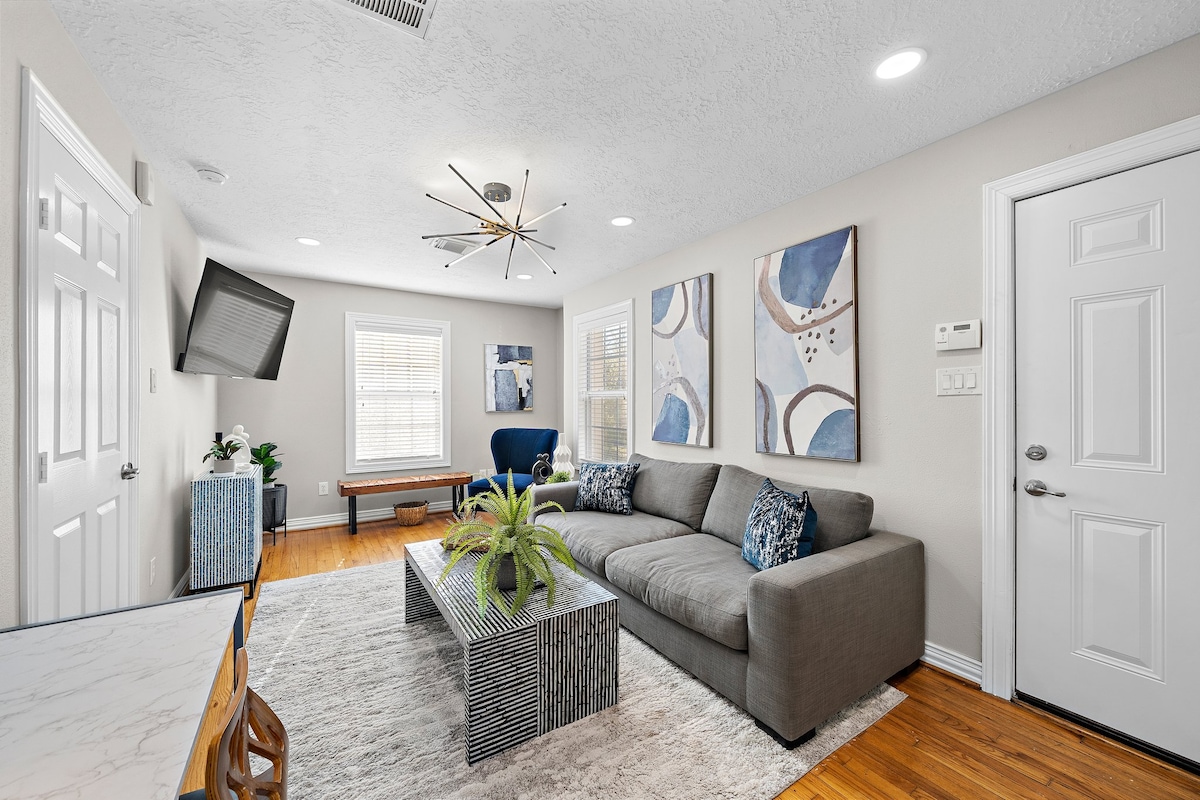 O Rústico (#3): Estúdio espaçoso, chique e impecavelmente projetado em um complexo recentemente reformado de 7 apartamentos distintos e de última geração com TUDO novo. O Rustic é um dos 2 grandes estúdios âncora com uma cozinha completa e áreas de estar e dormir separadas. Colchão e roupa de cama de pelúcia king-size; decoração caseira e confortável; iluminação ampla; tecnologia inteligente; eletrodomésticos novos. Bairro incrível com localização central a poucos passos de alguns dos melhores restaurantes e vida noturna de Houston...