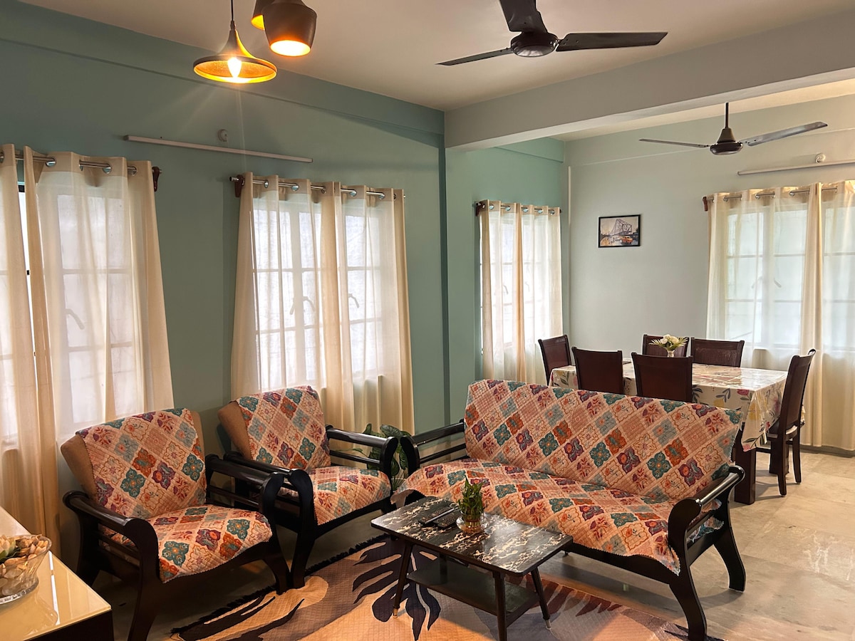 Welcome to your comfortable home in Greenfield City, Behala. This spacious 2BHK apartment is perfect for families, couples, and business travelers looking for a relaxed and well-connected stay. Both bedrooms are fully air-conditioned, ensuring a comfortable sleep after a long day. The living room features a large 50-inch Smart TV, a comfortable sofa, and a warm, inviting setup to unwind or enjoy your favorite shows. A dedicated dining table makes it easy to enjoy meals together.