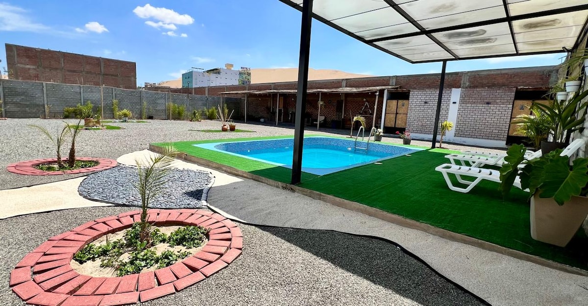 Alojamento agradável junto às dunas que circundam o oásis Huacachina em Ica, com apenas dois quartos confortáveis com uma excelente vista panorâmica das cordas que circundam o oásis Huacachina num ambiente agradável: 1 quarto duplo para 2 pessoas e 1 sala familiar para 4 pessoas,cozinha, sala de jantar, piscina, zona de barbecue, jardins, terraço e estacionamento privado
