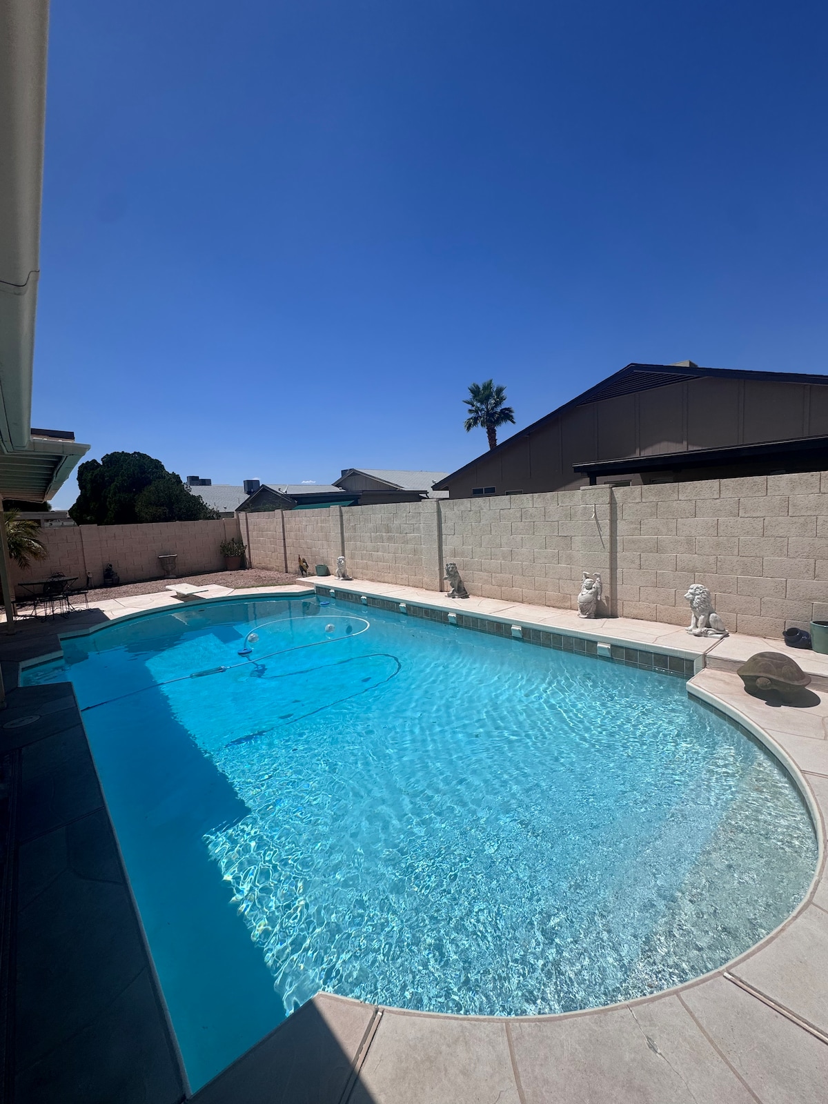 Viajantes, não procurem mais - a estadia perfeita para a noite está aqui! É hora de relaxar, desfrutar da família ou ter algum tempo para você. Casa de 1.815 pés quadrados com 3 camas/2 banheiros com piscina aquecida ou resfriada opcional. Apaixone-se por um interior atualizado e aconchegante, espaços de estar adequados para hóspedes, berço portátil e estação de troca, jogos de tabuleiro de trabalho em casa para se divertir! Lá fora, você encontrará uma linda piscina com fonte, chuveiro ao ar livre, gramado verde, jogos ao ar livre e um pátio coberto relaxante com TV. Apenas min. para Loop 101 e I-17