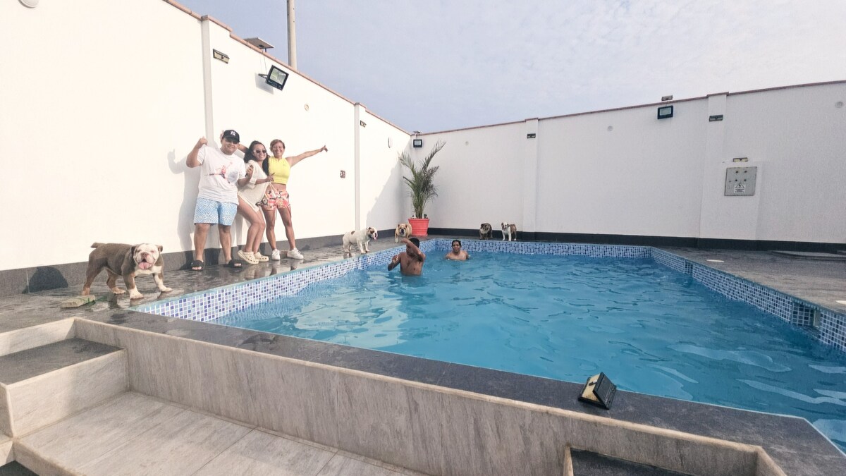 Alojamento agradável junto às dunas que circundam o oásis Huacachina em Ica, com apenas dois quartos confortáveis com uma excelente vista panorâmica das cordas que circundam o oásis Huacachina num ambiente agradável: 1 quarto duplo para 2 pessoas e 1 sala familiar para 4 pessoas,cozinha, sala de jantar, piscina, zona de barbecue, jardins, terraço e estacionamento privado