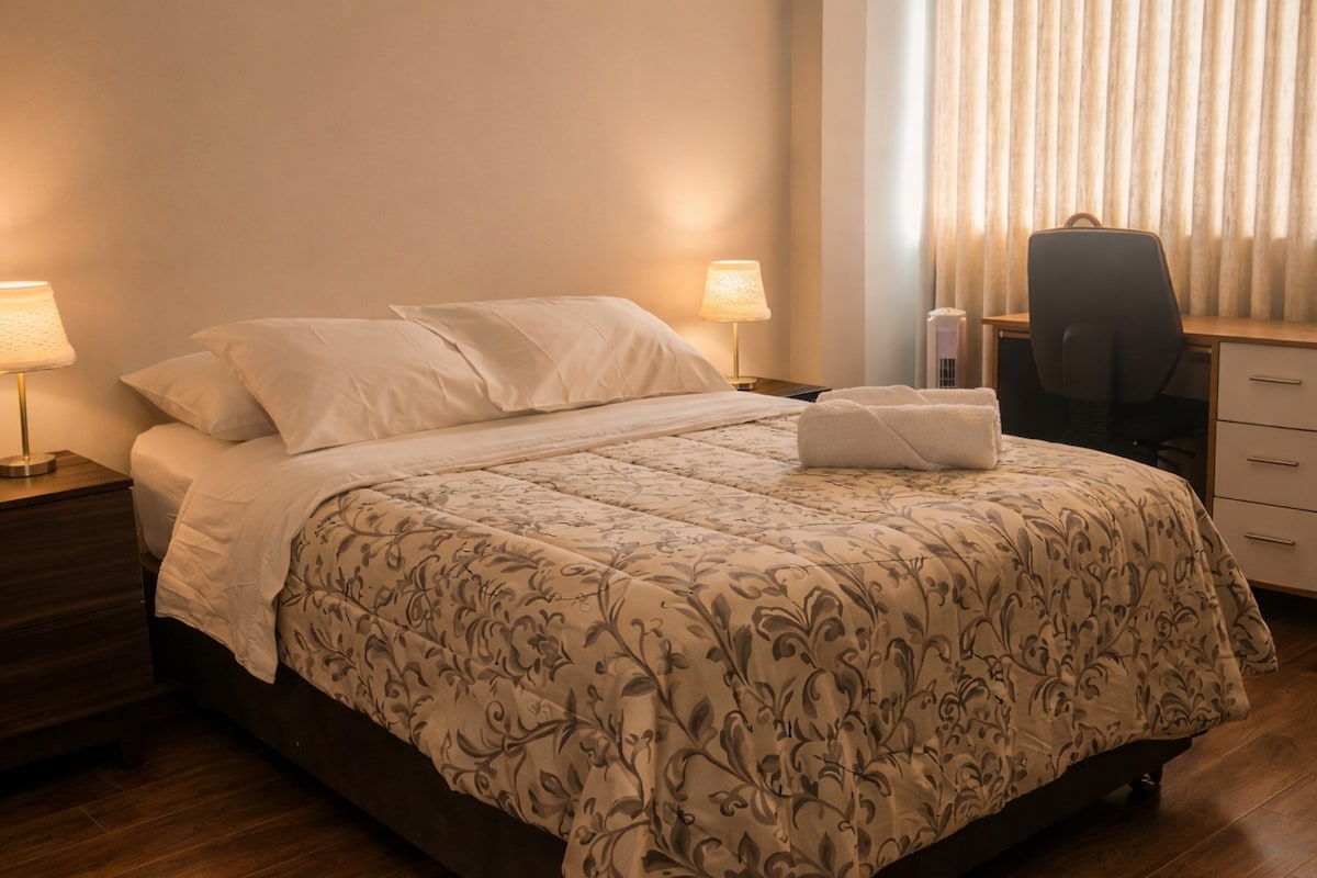 Relájate en familia o en pareja 💐 con Aire acondicionado en Sala❄️,Cafetera express para un Buen café☕️, cocina equipada,Camas muy cómodas, terraza para relajarte y todo lo que necesites para sentirte como en Casa. La casa de Ethan🏡 Dentro de un Condominio con mucha seguridad🚨, Áreas verdes🌱, Cámaras de seguridad📸para La Paz 🕊️de los que desean alojarse, cuenta con cocina,lavadora,caja china,cilindro,HBO, puede dejar su movilidad con tranquilidad y es Pet friendly, a solo 7m del centro