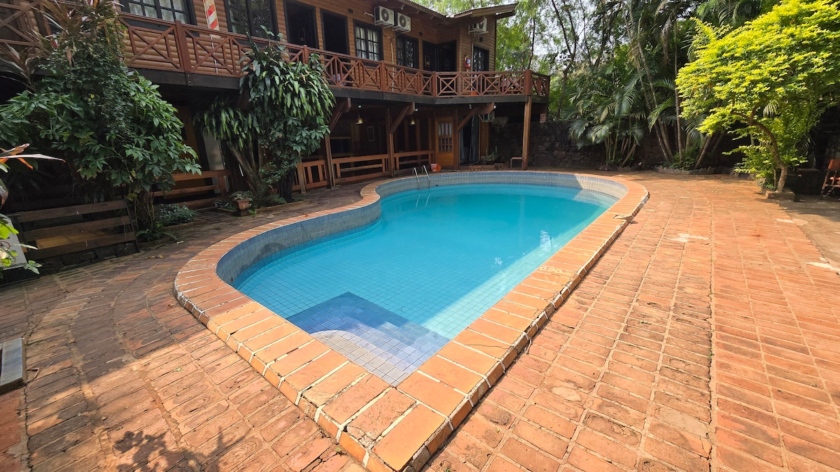 É uma casa com boa vegetação no interior, a maioria dos seus quartos têm vista para a piscina que está montada durante todo o ano. Está localizado a duas quadras da avenida principal onde você tem mobilidade onde você quer ir de ônibus e a poucos quarteirões da fronteira Argentina-Brasil