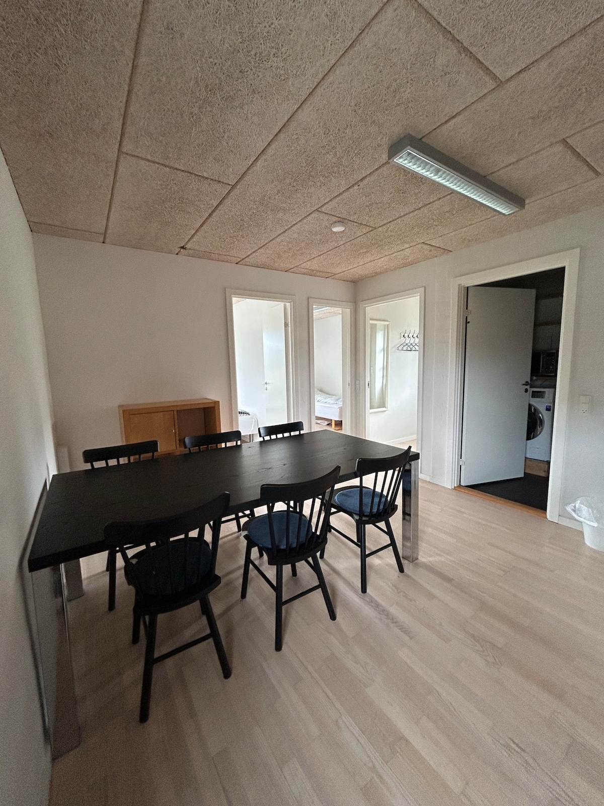 Quarto grande e luminoso recém-renovado em 1 andar com vistas fantásticas (e com a possibilidade de 2 camas extras, além de cama de casal) e quarto menor recém-renovado com tetos abobadados no piso térreo - também com vistas agradáveis e cama de casal. Há também uma grande sala de estar com a possibilidade de "cinema" hygge com tela grande, um jogo de futebol de mesa ou apenas puro relaxamento com um bom livro. O banheiro fica no térreo. Há um sofá-cama agradável e bons colchões box.