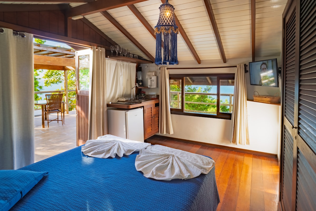Loft espaçoso de 22m² com cama de casal, ar-condicionado e Wi-Fi. Conta com cozinha equipada (fogão, geladeira, cafeteira e utensílios), ideal para preparar suas refeições. O espaço está em uma área tranquila, perfeita para descansar e se conectar com a natureza. Em apenas 10 minutos de caminhada, por uma trilha encantadora, você chega à Praia da Cueira. Um lugar especial para relaxar e viver a autêntica experiência de Boipeba.