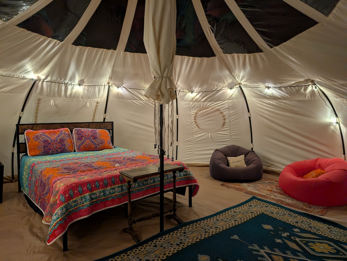 Bela tenda de sino de 13' por 13' em uma grande plataforma de madeira. Você tem sua própria fogueira, grelha de fogueira e um banco de madeira e lenha fornecidos. Você também tem uma mesa de piquenique com um guarda-sol. O acesso privado ao nosso sistema de trilhas de oito milhas fica a poucos metros da parte de trás da sua tenda. Você tem acesso a um chuveiro ao ar livre com água quente/fria instantânea e um banheiro portátil.