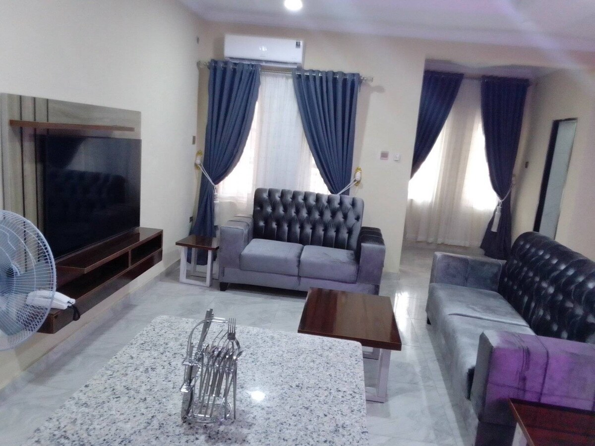 Nosso moderno apartamento de 2 quartos oferece um espaço aconchegante e elegante, ideal para relaxar ou trabalhar. Desfrute de uma cozinha totalmente equipada, sala de estar confortável e quartos espaçosos projetados para um sono tranquilo. A propriedade possui um grande complexo perfeito para eventos, encontros ou simplesmente curtir o ar livre. Localizado em uma área serena de Ilorin, você terá fácil acesso a atrações locais, restaurantes e compras. Se você está aqui para uma estadia curta, longa estadia.