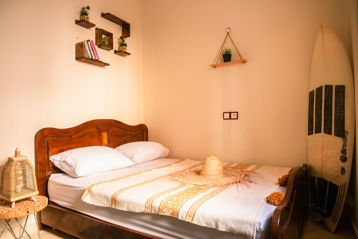 Cozy twin room inspired by the traditional charm of Fez, offering a peaceful and bright space to relax after a surf day. Located on the second floor of Nomazigh Surf House, guests can enjoy access to the chill terrace, co-working area and a rooftop with ocean view. Just a short walk to local bakery (1 min), Happy Tamraght restaurant (2 min), and Manzili Co-working (4 min). Close to popular surf spots like Devil’s Rock and Banana Point.