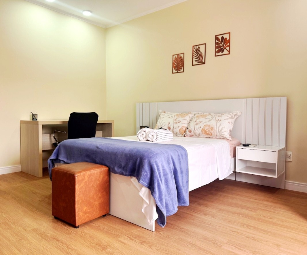 Relaxe neste espaço confortável, calmo, pratico e estiloso. Studio, Kitnet com quarto, cozinha, banheiro, office e lavanderia privativos. Equipada com Ar Condicionado, Internet Wifi, TV Smart, frigobar, micro-ondas, máquina de lavar e secar roupas, cafeteira, grill, ferro de passar, utensílios de cozinha, roupas de cama e banho. Portão e corredor de acesso compartilhados. Próxima do Aeroporto de Viracopos, a cidade possui maravilhosos parques, como o Parque Ecológico.