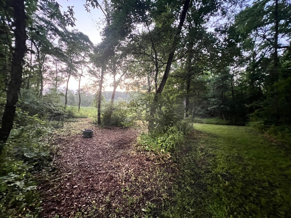 Welcome to our peaceful 30-acre property, where you can explore hiking and biking all day unwind in a fully furnished glamping tent! Our tent is equipped with two comfy twin cots, bedside tables for your convenience, and charming outdoor seating to enjoy nature. As the sun sets, gather around the fire pit under the stars. It’s the perfect spot for a peaceful getaway, whether you’re stargazing or just soaking up the quiet countryside.
